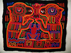 Early 1970’s two predatory birds embracings a human-like image and several other zoomorphic motifs. Mola from the Harp Collection