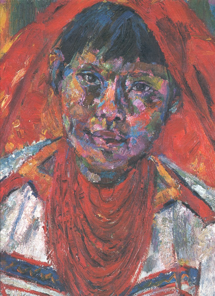 Foreign Faces molas, 18” height x 14 ½” width, c. 1970. These companion portrait molas depict two large non-Kuna or foreign female faces with small tutelary spirit figures and birds. The mola with the red fabric background depicts a woman with hair ornaments wearing earrings and an elaborate necklace; two spirit figures are on her lower left and right. The mola with the black fabric background depicts a girl wearing eyeglasses and hair barrettes who appears to be playing the flute with two spirit birds to her lower left and right. Barkowitz collection. Photographs by Ben Crouch.